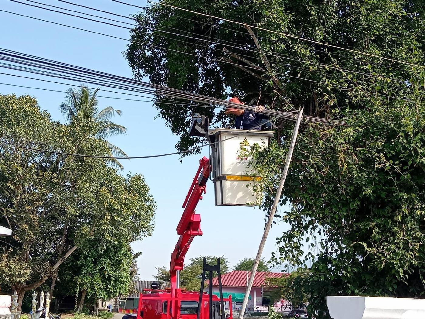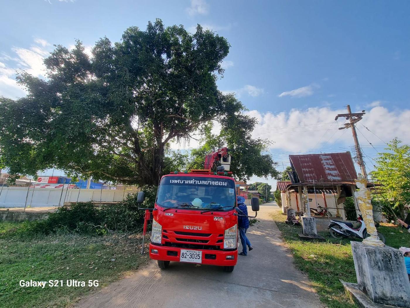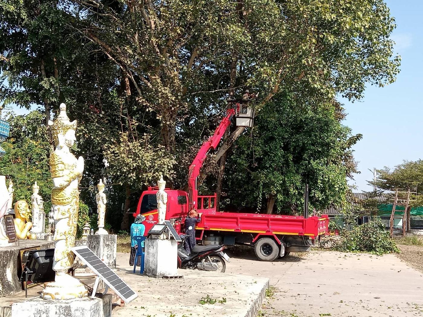 เจ้าหน้าที่กองช่างเทศบาลตำบลยางฮอม นำรถกระเช้าไฟฟ้าติดตั้งเครนไฮดรอลิก ลงพื้นที่ ณ วัดยางฮอม เพื่อตัดกิ่งไม้ปรับปรุงพัฒนาสภาพแวดล้อม ให้มีสภาพแวดล้อมที่ดี และปลอดภัย
