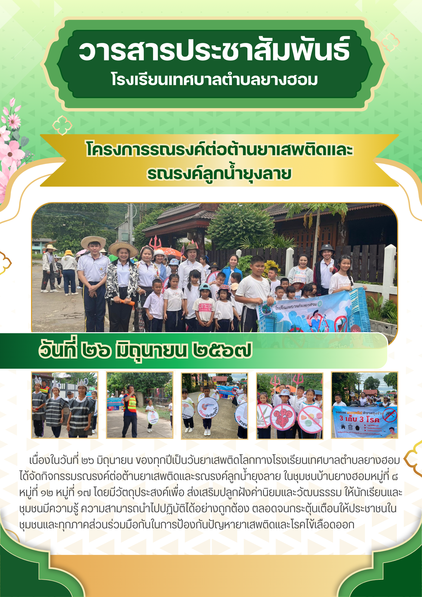 #โรงเรียนเทศบาลตำบลยางฮอม โดยการบริหารงานของ #นางลาวรรญ ธนรุ่งเรืองเดช #นายกเทศมนตรีตำบลยางฮอม ได้จัดทำโครงการรณรงค์ต่อต้านยาเสพติดและกำจัดลูกน้ำยุงลาย ในชุมชนบ้านยางฮอมหมู่ที่ 8 หมู่ที่ 12 และหมู่ที่ 17 เพื่อเป็นการส่งเสริมและปลูกฝังค่านิยมและวัฒนธรรม ให้นักเรียนและชุมชนมีความรู้ ความสามารถนำไปปฏิบัติได้อย่างถูกต้อง ตลอดจนกระตุ้นเตือนให้ประชาชนในชุมชนและทุกภาคส่วนร่วมมือกันในการป้องกันปัญหายาเสพติดและโรคไข้เลือดออก