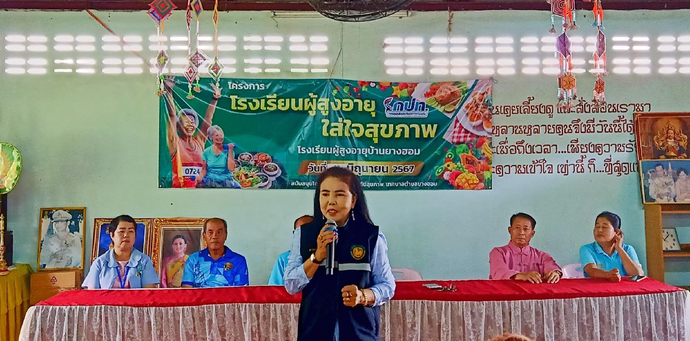 นางลาวรรญ ธนรุ่งเรืองเดช นายกเทศมนตรีตำบลยางฮอม เป็นประธานกล่าวเปิดโครงการโรงเรียนผู้สูงอายุใส่ใจสุขภาพ ปี 2567 ณ หอประชุมโรงเรียนผู้สูงอายุบ้านยางฮอม โดยมีผู้บริหารและเจ้าหน้าที่กองสาธารณสุขเข้าร่วม จัดโดยกลุ่มกองทุนสวัสดิการชุมชน เป้าหมายประกอบด้วยประชาชนวัยทำงาน 50 คนได้รับการสนับสนุนงบประมาณจากกองทุนหลักประกันสุขภาพระดับท้องถิ่นหรือพื้นที่เทศบาลตำบลยางฮอม