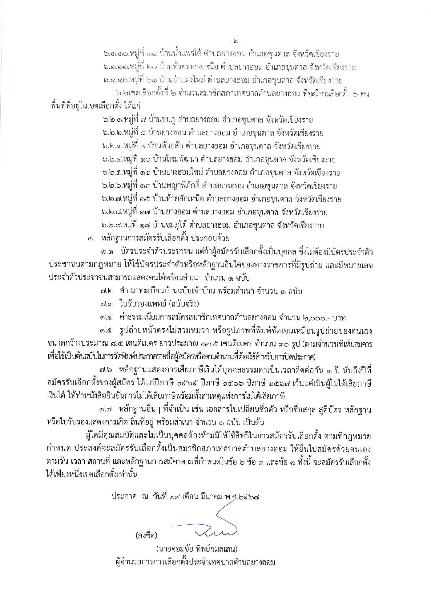 ประกาศผู้อำนวยการการเลือกตั้งประจำเทศบาลตำบลยางฮอม อ.ขุนตาล จ.เชียงราย