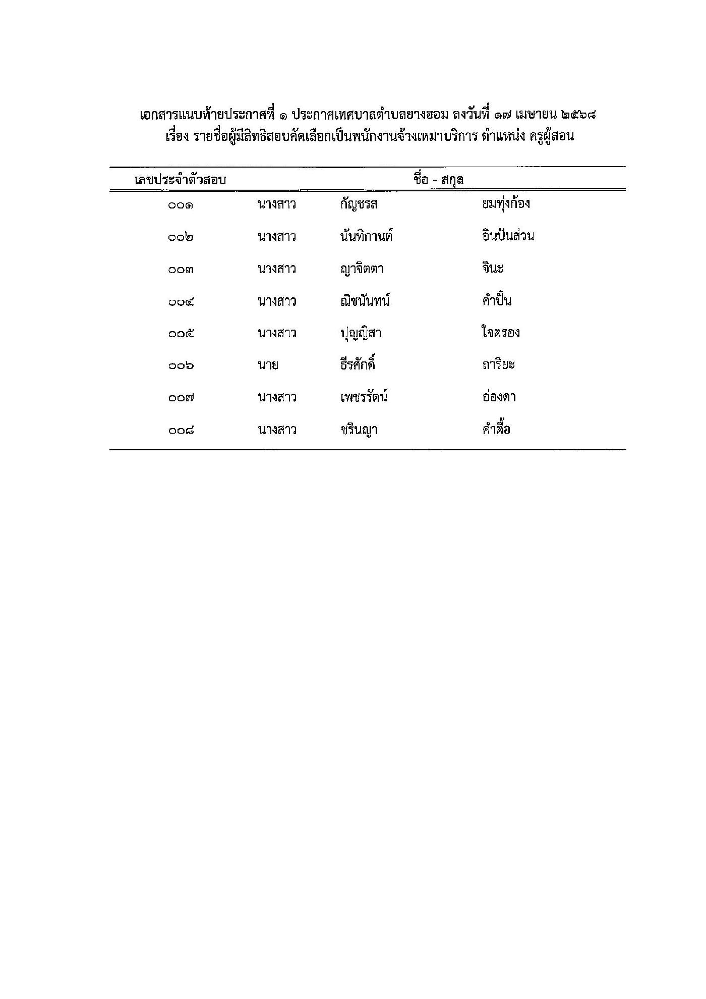 เรื่อง รายชื่อผู้มีสิทธิสอบคัดเลือกเป็นพนักงานจ้างเหมาบริการ ตำแหน่ง ครูผู้สอน
