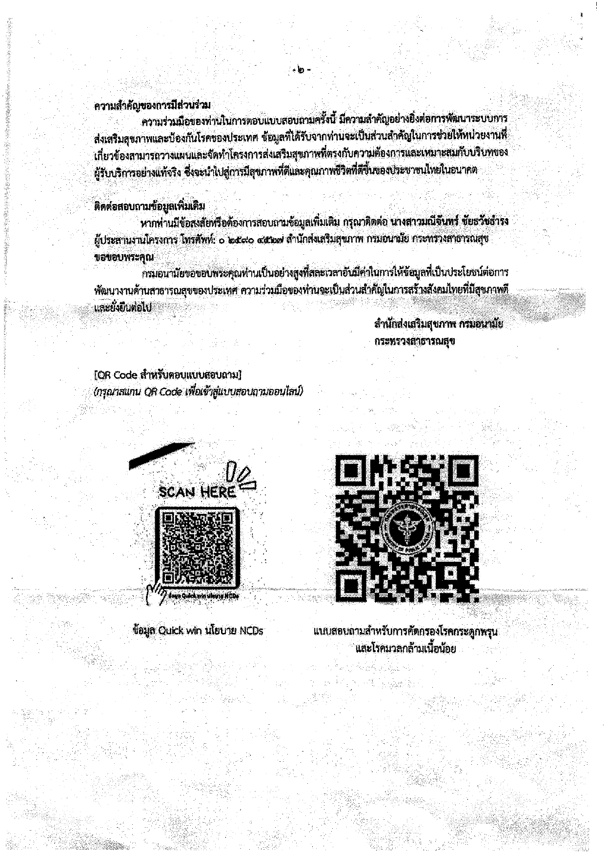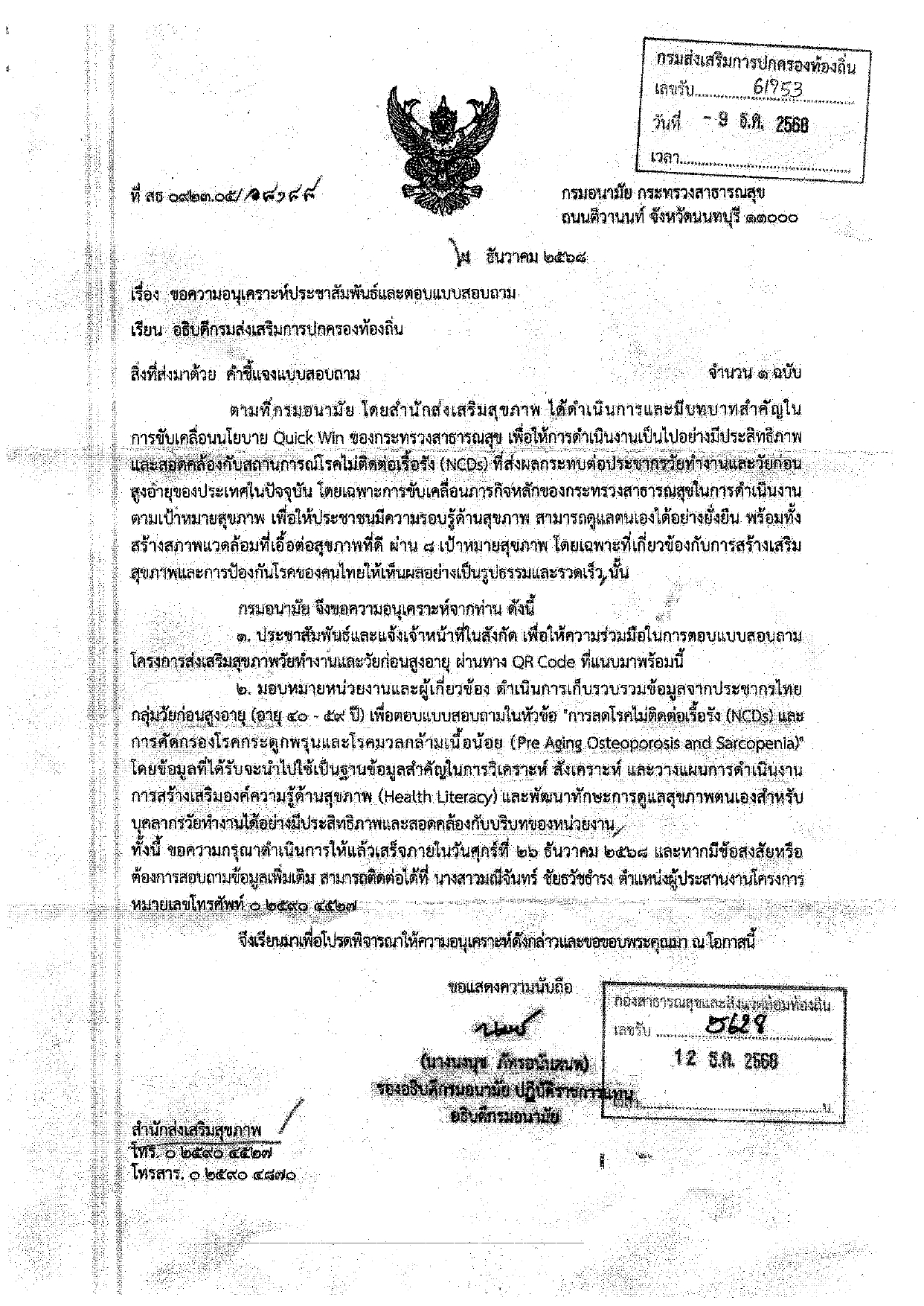ลงวันที่ 9 มกราคม 2568 เรื่อง ขอความอนุเคราะห์ประชาสัมพันธ์และตอบแบบสอบถาม สำนักงานส่งเสริมการปกครองท้องถิ่นจังหวัดเชียงรายว่า กรมอนามัย โดยสำนักส่งเสริมสุขภาพ ได้ดำเนินการและบทบาทสำคัญในการขับเคลื่อนนโยบาย Quick Win ของกระทรวงสาธารณสุข เพื่อให้ดำเนินงานเป็นไปอย่างมีประสิทธิภาพและสอดคล้องกับสถานการณ์โรคไม่ติดต่อเรื้อรัง (NCDs) ที่ส่งผลกระทบต่อประชากรของประเทศโดยมี 8 เป้าหมายสุขภาพ โดยเฉพาะที่เกี่ยวข้องกับการสร้างเสริมสุขภาพและการป้องกันโรคของคนไทย