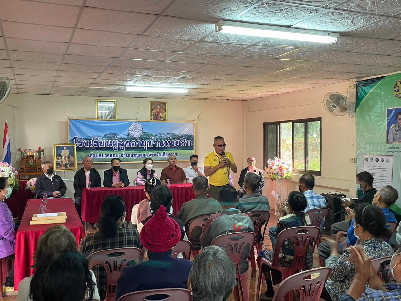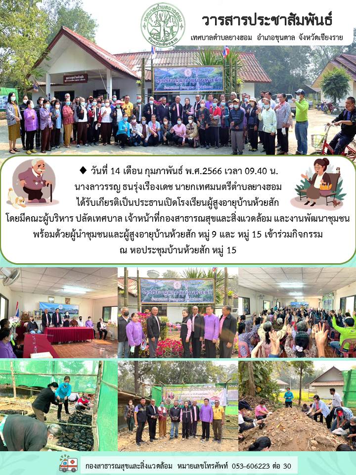 นางลาวรรญ ธนรุ่งเรืองเดช ตำแหน่ง นายกเทศมนตรีตำบลยางฮอม ได้รับเกียรติเป็นประธานเปิดโรงเรียนผู้สูงอายุบ้านห้วยสัก โดยมีคณะผู้บริหาร ปลัดเทศบาล เจ้าหน้าี่กองสาธารณสุขและสิ่งแวดล้อม และงานพัฒนาชุมชน พร้อมด้วยผู้นำชุมชนและผู้สูงอายุ บ้านห้วยสัก หมู่ที่ 9 และหมู่ที่ 15 เข้าร่วมกิจกรรม ณ หอประชุมบ้านห้วยสัก หมู่ที่ 15